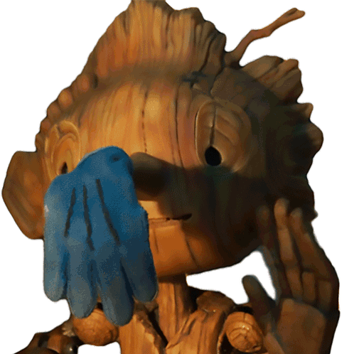 Guillermo del Toro's Pinocchio waves hello with a blue-gloved hand, offering a friendly greeting.