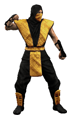 An animated sticker of Scorpion from Mortal Kombat in his iconic yellow and black ninja outfit, ready for battle.