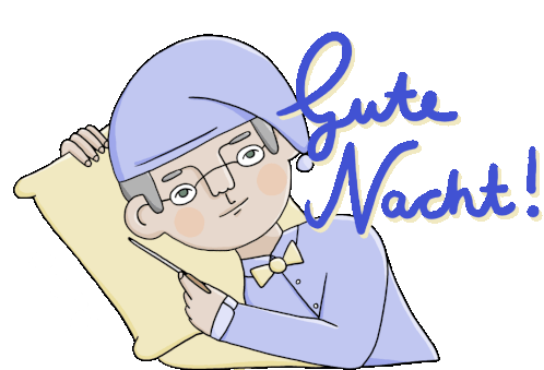 A sleepy WDR3 classical music conductor in pajamas and nightcap, ready for bed, wishing 'Good Night!'.
