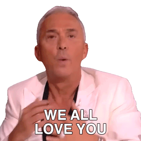 Bruno Tonioli from Britain's Got Talent expresses love, saying 'We All Love You' with hands on his chest.