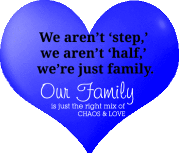 A vibrant blue heart sticker featuring the heartwarming quote: 'We aren't 'step,' we aren't 'half,' we're just family. Our Family is just the right mix of CHAOS & LOVE'.