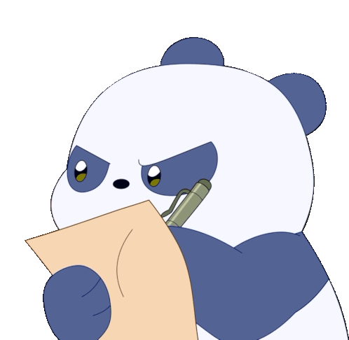 A focused panda from We Baby Bears is diligently writing on a piece of paper with a pen.