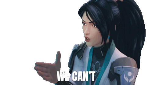 Sage from Valorant expresses frustration, saying 'WE CAN'T' with an outstretched hand in this animated sticker.
