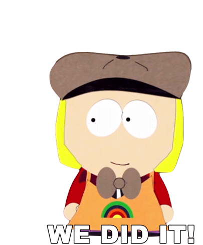 Pip Pirrip from South Park excitedly exclaims 'We Did It!' celebrating a successful achievement.