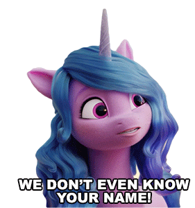 Izzy Moonbow from My Little Pony expresses confusion with 'We don't even know your name!' then smiles.