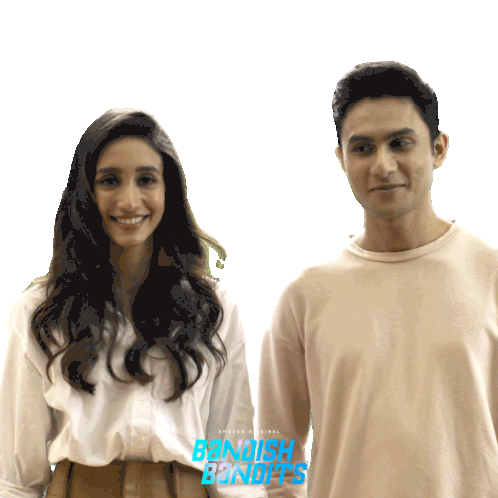 A happy couple from Bandish Bandits forms a heart with their hands, radiating love and cuteness.