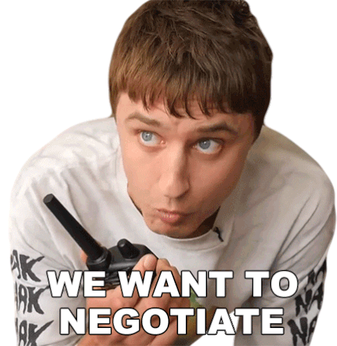 Danny Mullen holds a walkie-talkie and says 'WE WANT TO NEGOTIATE' with an intense expression.