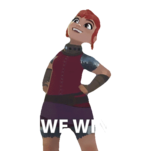 Nimona, voiced by Chloë Grace Moretz, strikes a confident pose with "WE WIN" text, celebrating victory from the Netflix movie.