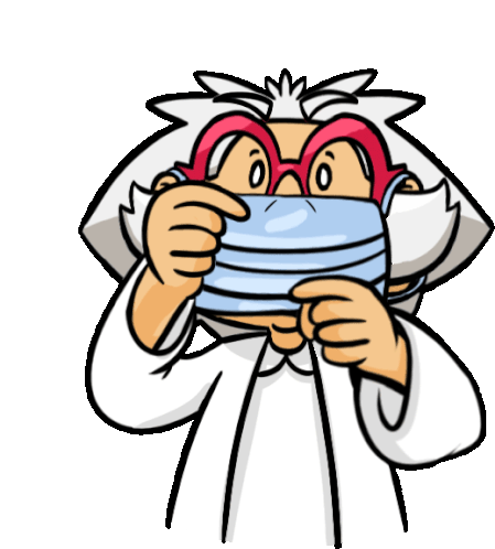 Dreinesco, a cartoon scientist, carefully puts on a blue surgical face mask, promoting mask-wearing.