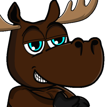 A cartoon moose with glowing blue eyes and a sly, conniving grin clasps its hands, exuding mischief.