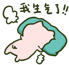 An adorable Wechat pig sticker animatedly shakes its head while comfortably resting on a soft green pillow.