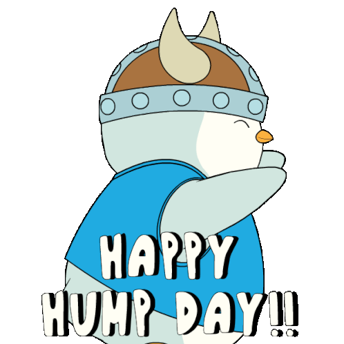 A cheerful Pudgy Penguin in a Viking helmet waddles happily, wishing everyone a 'Happy Hump Day!' for Wednesday.