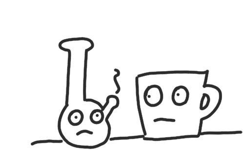 Animated sticker featuring a sad coffee cup and a bong, with smoke rising, perfect for a wake and bake mood.
