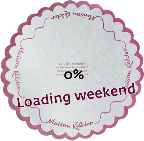 A delicious Maison Kelder cake animates as a 'Loading Weekend' bar fills up from 10% to 100%, celebrating the start of the weekend.