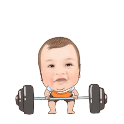 A determined cartoon baby struggles to lift a heavy barbell, then celebrates its successful weightlifting feat.
