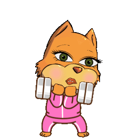 Animated Sugr Sugr character performing bicep curls with dumbbells, showing off her gym workout.