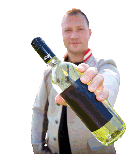 A man holds a bottle of 'Save Water' wine, promoting a fun and eco-conscious winetime message.