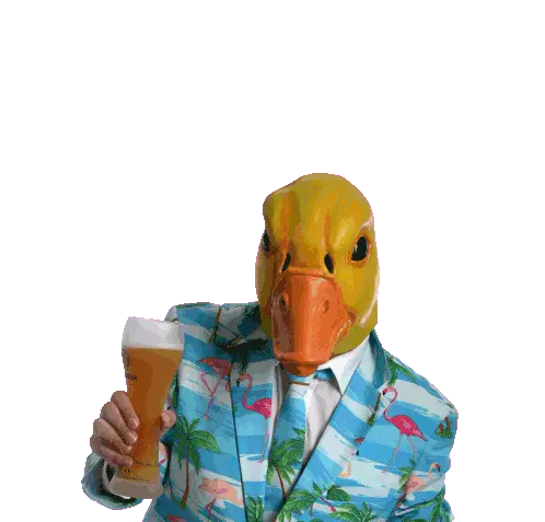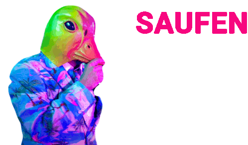 A person in a vibrant suit and duck mask makes a thinking gesture, with the German words 'Saufen' and 'Weiter' appearing. Features Ingo Ohne Flamingo and Talstrasse3Bis5.