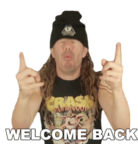 Bradley Hall, wearing a Crash Bandicoot shirt, enthusiastically welcomes back with rock-and-roll hand gestures.