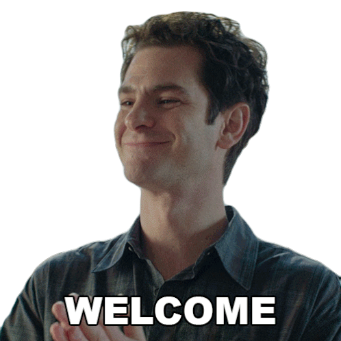 Andrew Garfield as Jon Larson claps and smiles, extending a warm welcome.