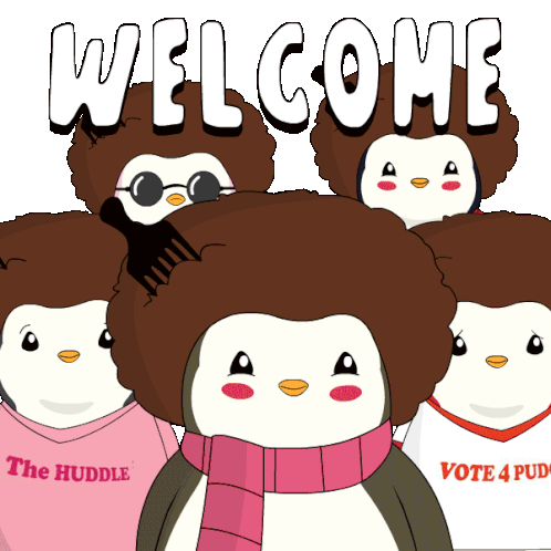 A group of adorable afro-wearing penguins welcomes you with a 'WELCOME' message and 'The HUDDLE' shirts.