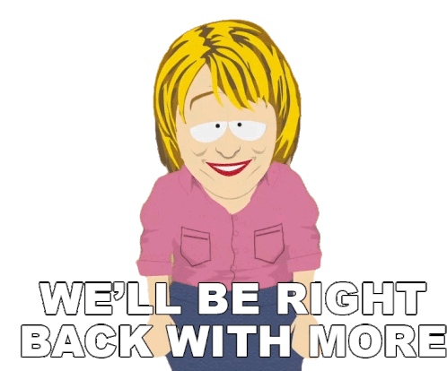 A South Park character, likely Sharon Marsh, with a surprised expression, displaying the classic 'We'll be right back with more' message.