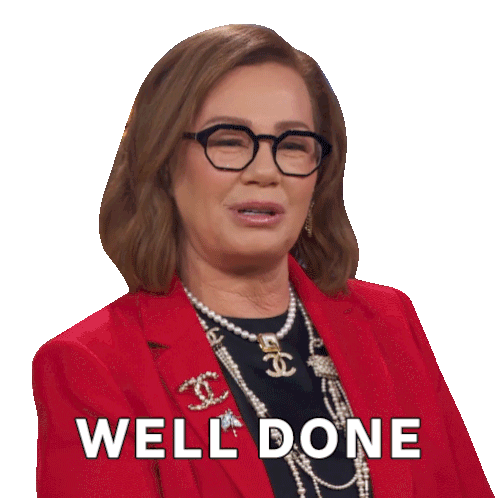 Arlene Dickinson, wearing glasses and a red jacket, smiles as the text 'WELL DONE' appears, conveying approval.