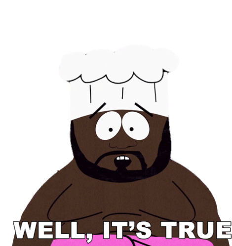 Jerome Chef McElroy from South Park, wearing his chef hat, confirms something with a sincere 'Well, it's true.'