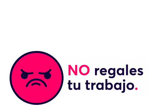 Angry pink emoji face with the message 'NO regales tu trabajo' (DO NOT give away your work), promoting fair compensation.