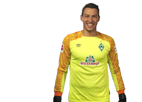 Werder Bremen goalkeeper Pavlenka celebrates a strong moment in a football match, showing his excitement.