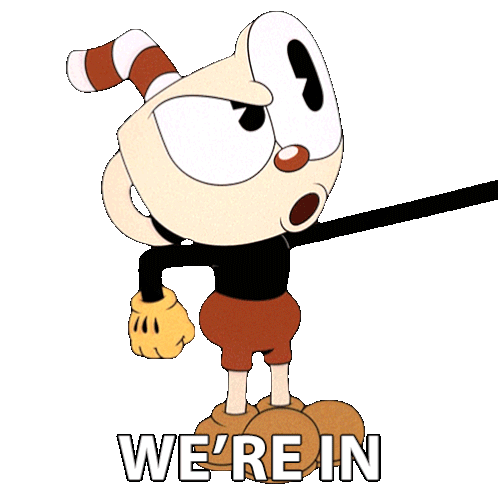 Cuphead from The Cuphead Show winks and smiles, declaring 'We're In!' with enthusiasm and readiness.
