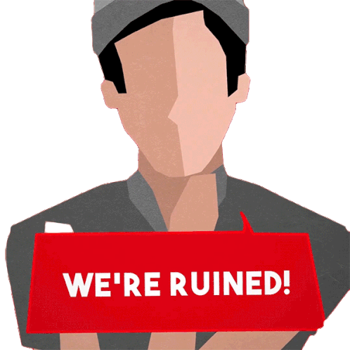 A red speech bubble with the text 'WE'RE RUINED!' displayed over a person's chest, conveying despair.