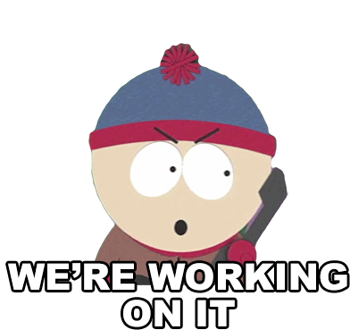 Stan Marsh from South Park says 'We're Working On It' with a determined and slightly annoyed expression.