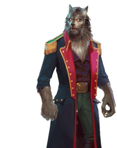 An animated werewolf character from Seekers Notes, depicted in a detailed military-style uniform, subtly moves and blinks.