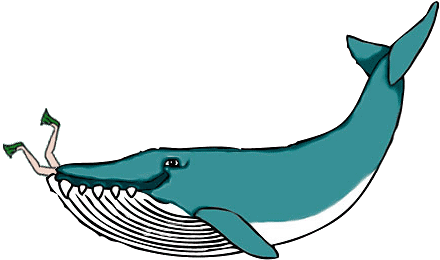 A cartoon blue whale with sharp teeth appears to be eating a person, with only their green-shoed legs visible.