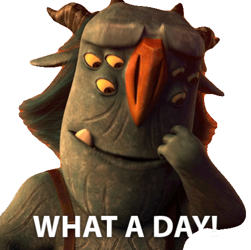 Blinky from Trollhunters expresses exhaustion with a sigh and the caption 'WHAT A DAY!' after a long day.