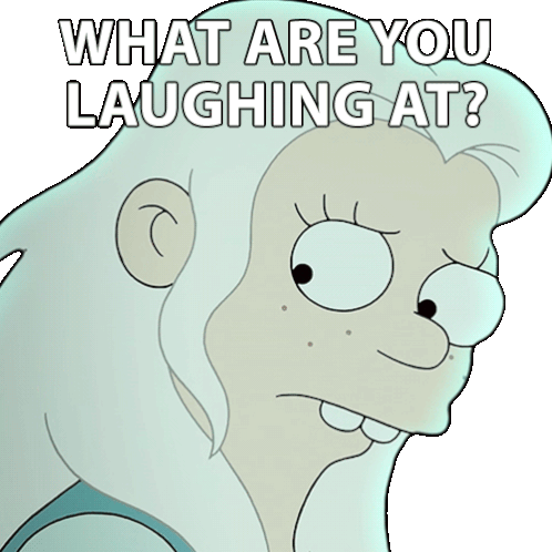 Bean from Disenchantment looks confused and asks, "WHAT ARE YOU LAUGHING AT?" in this animated sticker.