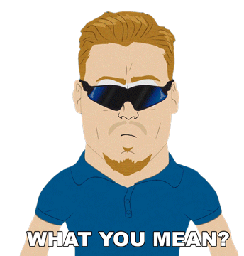 A South Park character, Randy Marsh, wearing sunglasses, asks 'WHAT YOU MEAN?' with a confused expression.