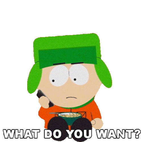 Kyle Broflovski from South Park looks annoyed while holding a bowl of cereal, asking "What do you want?".