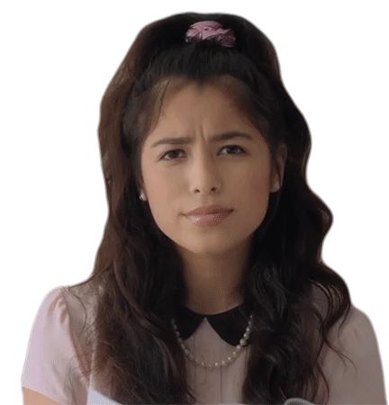 A young woman with dark, wavy hair and a pearl necklace displays a confused and slightly annoyed expression.