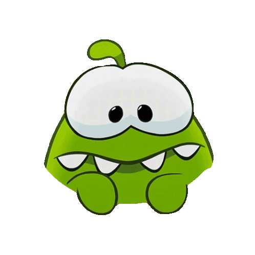 Om Nom, the green monster from Cut the Rope, looks around with a curious and slightly confused expression, wondering about its surroundings.