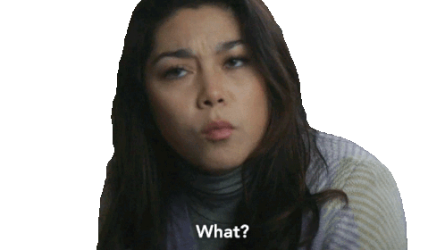 Isabella Chen Lopez looks confused and surprised, asking 'What?' in a striped sweater.