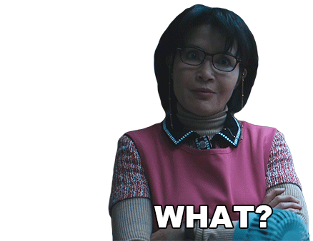 Mrs Chen (Peggy Lu) looks surprised and asks 'What?' with a confused expression, wearing glasses and a pink apron.