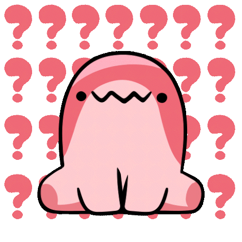 Fruttidino, the cute pink character, looks confused and unsure with question marks appearing around him.
