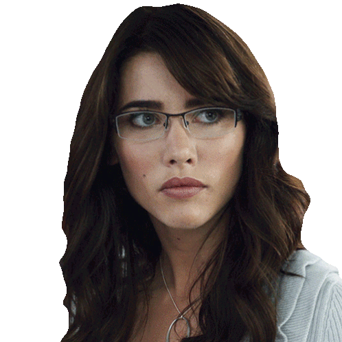Olivia Castle from Final Destination 5 reacts with a surprised 'WHAT?' expression, wearing glasses and a necklace.