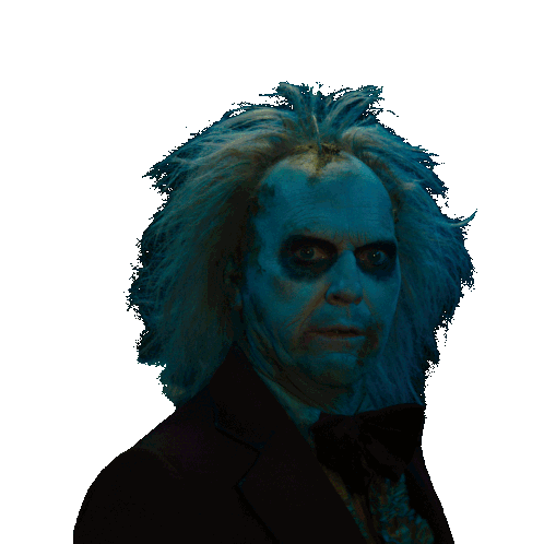 Michael Keaton as Beetlejuice looks confused and surprised with the text 'WHAT THE...' appearing on screen.