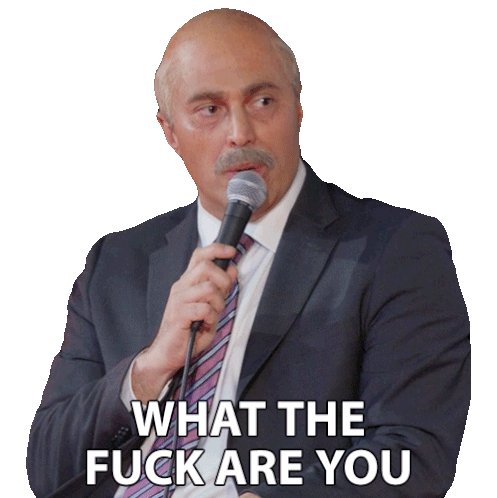Adam Ray as Dr. Phil, holding a microphone and asking 'What the f*** are you talking about?' in a comedic moment.