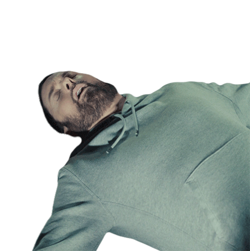 Eminem, lying down in a grey hoodie, reacts with a surprised expression, exclaiming 'What The Fuck'.