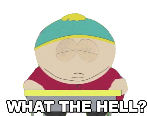 Eric Cartman from South Park angrily exclaims "WHAT THE HELL?" while sitting at a desk.