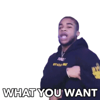 Leeky Bandz gestures emphatically, asking 'What You Want' with expressive hand movements and a questioning look.
